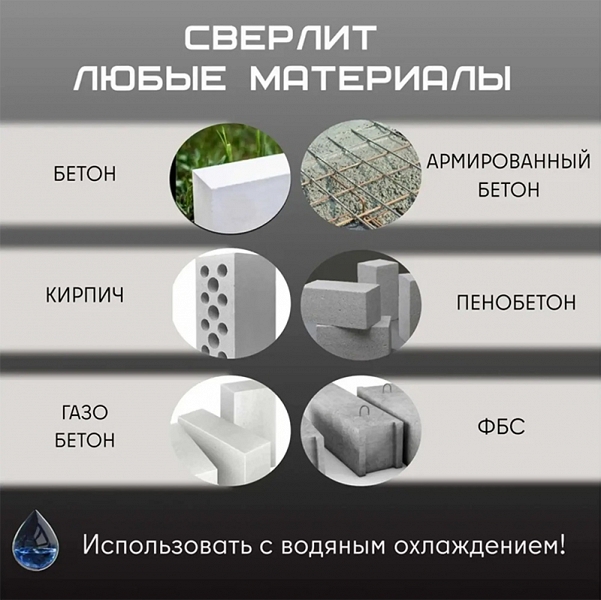 - Эффективно работает на оборудовании для алмазного сверления мощностью 1,2 – 3,5 кВт